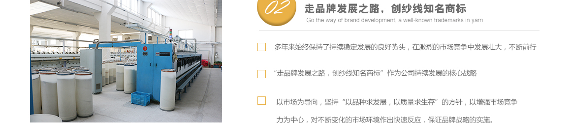 太倉市高陽工貿(mào)有限公司是專業(yè)從事特種紗生產(chǎn)十數(shù)年的一線生產(chǎn)廠家,坐落于江蘇省蘇州市太倉市雙鳳鎮(zhèn)新湖建湖路29號,太倉隸屬長江三角洲經(jīng)濟圈,交通便捷,經(jīng)濟發(fā)達,是著名的紡織生產(chǎn)基地。 公司歷史要追溯到1982年就成立的新湖毛紡織廠。1996年,毛紡織廠與上海二十二棉在新湖聯(lián)合組建了太倉市新湖福利綜合廠。2002年為適應市場的飛速變化,公司轉(zhuǎn)制重組更名為太倉市高陽工貿(mào)有限公司。同時公司適時調(diào)整生產(chǎn)經(jīng)營策略,調(diào)整產(chǎn)品品種結(jié)構(gòu),把生產(chǎn)特種紗作為主要發(fā)展方向,純棉、滌綸竹節(jié)紗是我們的主要產(chǎn)品。 公司多年來始終保持了持續(xù)穩(wěn)定發(fā)展的良好勢頭,在激烈的市場競爭中發(fā)展壯大,不斷前行。我們把“走品牌發(fā)展之路,創(chuàng)紗線知名商標”作為公司持續(xù)發(fā)展的核心戰(zhàn)略。以市場為導向,堅持“以品種求發(fā)展,以質(zhì)量求生存”的方針,以增強市場競爭力為中心,對不斷變化的市場環(huán)境作出快速反應,品牌戰(zhàn)略的實施。公司注重專業(yè)人才的引進和先進技術(shù)的生產(chǎn)化應用,具備較強的研發(fā)設計和生產(chǎn)能力。 公司一直把“品質(zhì)、創(chuàng)新、誠信”作為企業(yè)文化建設的核心。以品質(zhì)來獲得客戶的滿意,以創(chuàng)新來贏得客戶的贊賞,以誠信來博得客戶的信心。我們把“準時的交貨期,提供零缺點的產(chǎn)品和服務”作為奮斗目標,贏得了客戶的支持和良好的市場信譽。 高陽工貿(mào)有限公司愿與廣大客戶加強合作,共享信息,迎接挑戰(zhàn),共同發(fā)展。客戶需求。了解詳細>>